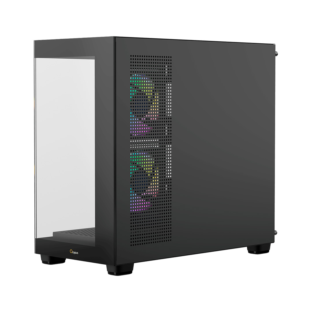 Ocypus Gamma C52 BK ARGB — современный корпус с эффектной панорамной передней и боковой стеклянной панелью толщиной 4 мм, лишённой вертикальной стойки. Такой дизайн открывает максимально обзорную компоновку и подчёркивает внутреннее железо, создавая впечатляющую воздушность сборки. Продуманная циркуляция воздуха и множество мест под вентиляторы обеспечивают мощный поток, позволяющий поддерживать стабильные температуры даже у производительных комплектующих. Корпус поддерживает современные материнские платы с обратным подключением, скрывая все кабели за подложкой и формируя аккуратный минималистичный внешний вид. Умная планировка пространства позволяет разместить длинную видеокарту длиной до 425 мм, блок питания до 250 мм и полноценную систему охлаждения с крупными радиаторами.
