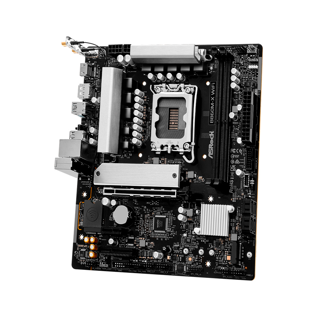 ASRock B860M-X WiFi создана как практичное и мощное решение для систем на базе процессоров Intel Core Ultra в разъёме LGA1851. Плата использует 6-слойную PCB для стабильной передачи сигналов и уверенной работы при длительных нагрузках. Поддержка DDR5 с возможностью разгона, два слота M.2 (включая Blazing PCIe Gen5), а также мощная подсистема питания формата 7+1+1+1+1 обеспечивают высокую производительность в играх и рабочих задачах. Встроенный модуль Wi-Fi 6E и 2.5G LAN ускоряют сетевые подключения, а HDMI и DisplayPort позволяют вывести изображение на современные мониторы. Поддержка RGB-подсветки и полезные функции вроде BIOS Flashback облегчают сборку и настройку системы.