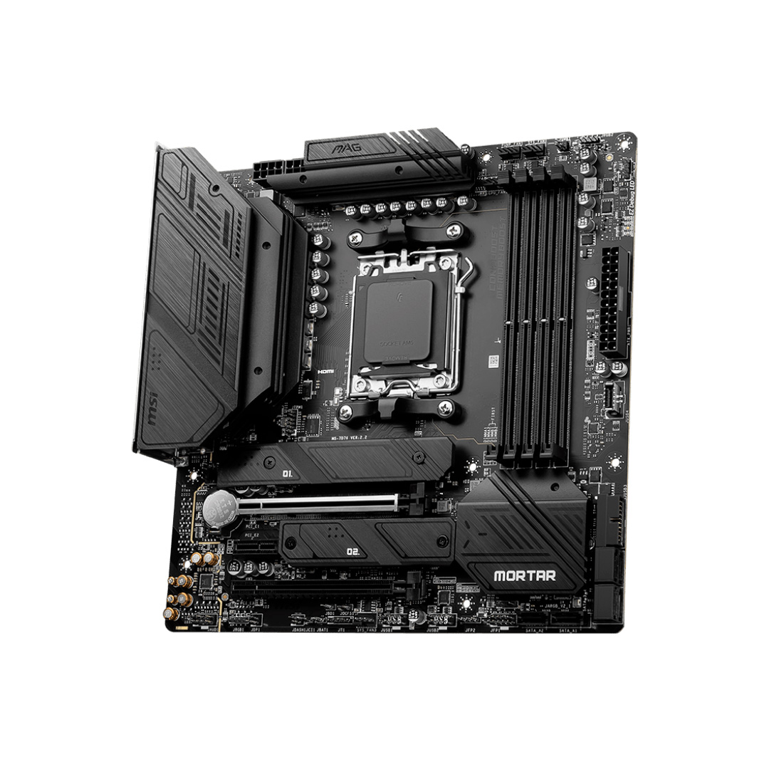 MSI MAG B650M MORTAR WIFI — это mATX-решение для сборки мощных систем на базе процессоров AMD Ryzen серий 9000, 8000 и 7000 под сокет AM5. Оснащена чипсетом AMD B650, она поддерживает до 256 ГБ оперативной памяти DDR5 с частотой до 7600+ МГц (в разгоне), обеспечивая высокую пропускную способность и стабильность благодаря SMT-слотам и технологии Memory Boost. Плата оснащена двумя слотами PCIe x16 Gen4 с усилением Steel Armor для тяжёлых видеокарт, двумя разъёмами M.2 PCIe 4.0 с охлаждением Shield Frozr и шестью портами SATA3 с поддержкой RAID.