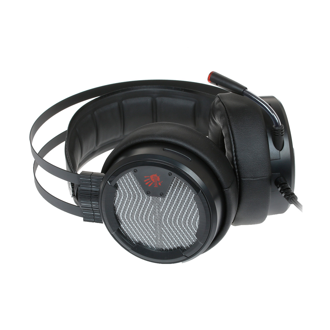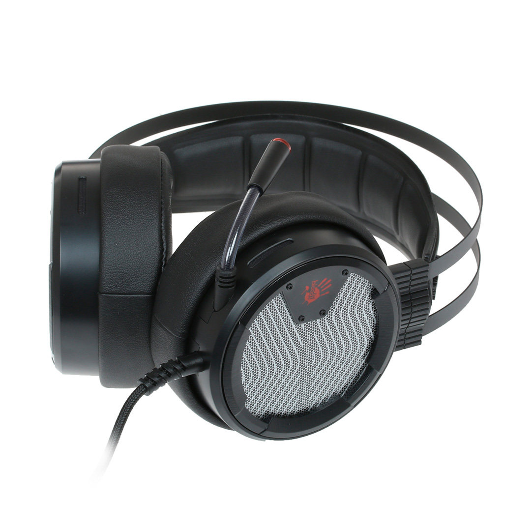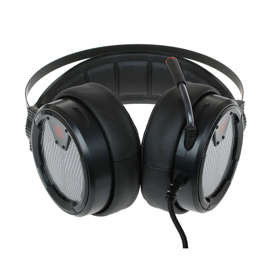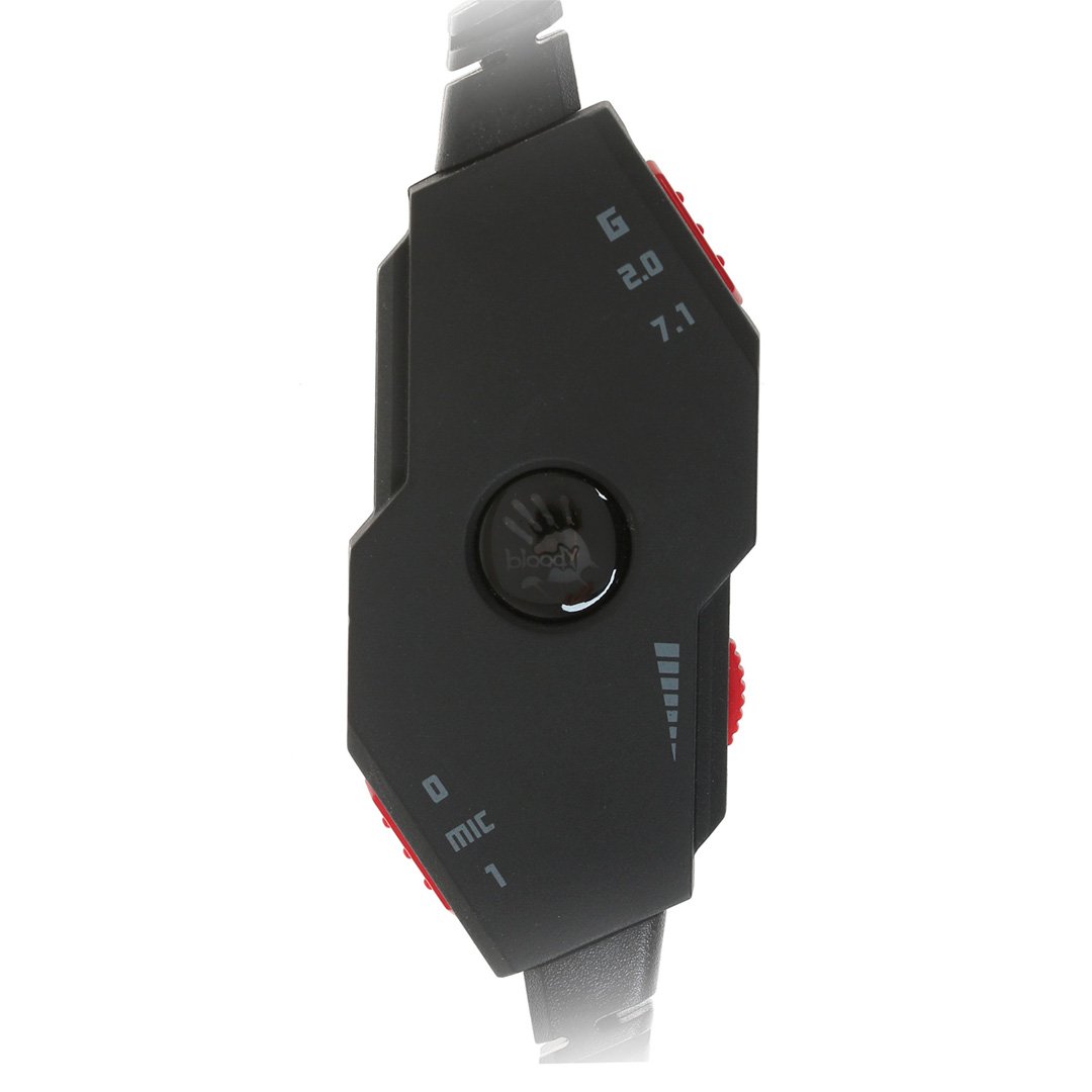 Наушники M620t Bloody выглядят достаточно массивно, но при этом обладают небольшим весом. Лаконичный дизайн дополняет яркая неоновая подсветка. Каркас гарнитуры выполнен из прочного металла темно-серого цвета и фиксируется к корпусу при помощи 4 болтов (не предусматривает механизма регулировки). Длина каждой дуги каркаса составляет 33,5 см. Комфортную посадку и регулирование размера обеспечивает дополнительное мягкое оголовье. При надевании наушники автоматически подстраиваются под размеры головы, но их положение не фиксируется: после снятия гарнитуры мягкое оголовье возвращается в изначальную форму.